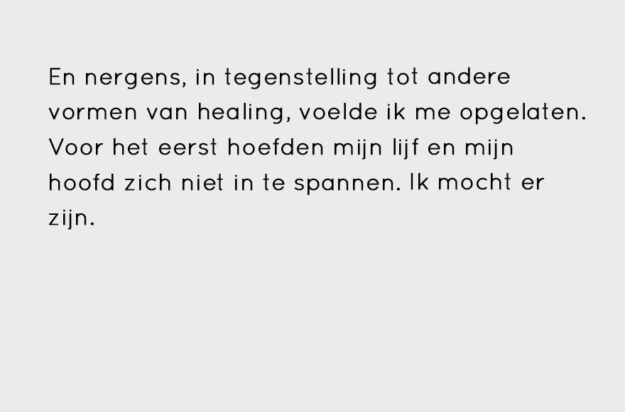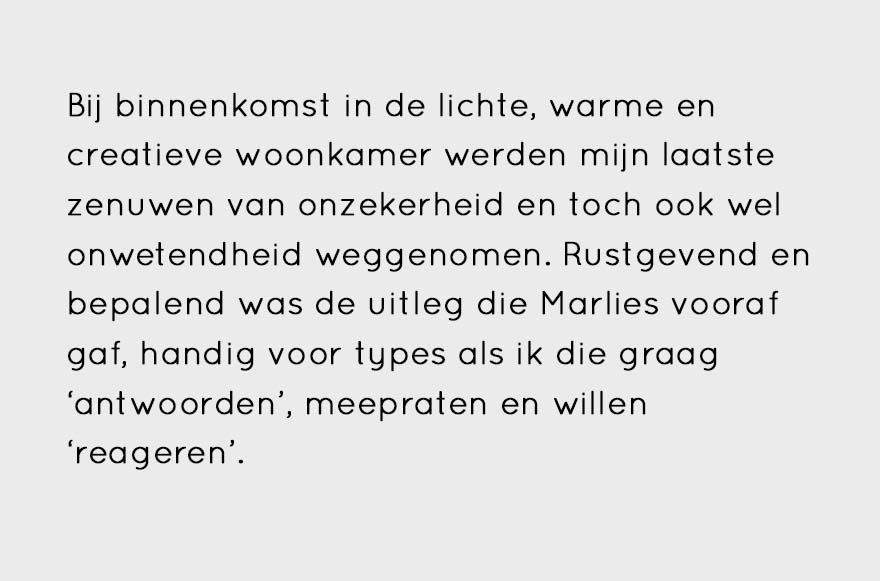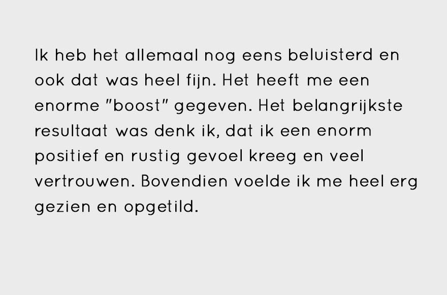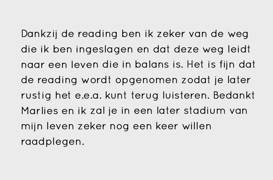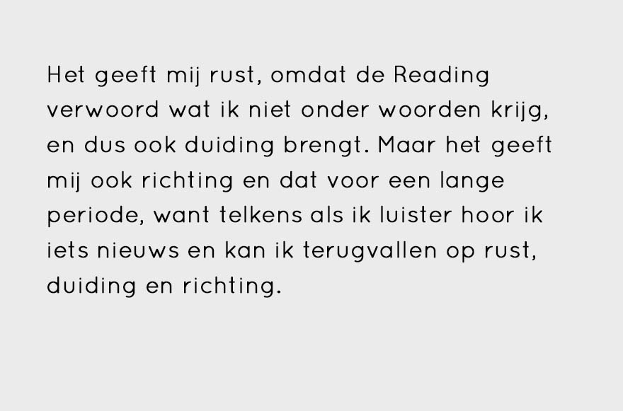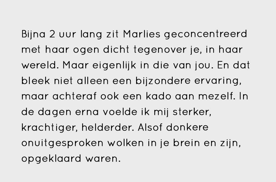 “Een energetisch consult zorgt voor zachte, maar zeer diepgaande heling en transformatie. Vaak denkt degene die de reading ontvangt dat ik de beelden uit de reading genereer, maar in feite is hij of zij het zelf, die de beelden met bijbehorende verrassende inzichten aan zichzelf laat zien. Ik ben slechts de ‘doorgever’. En juist daarom werkt het ook zo goed! Het is heel eigen, waardoor het veel makkelijker geïntegreerd kan worden, dan wanneer een extern persoon je ‘oplossingen’ aandraagt. Het is eigenlijk een ultieme vorm van zelf-healing. Voor mij is het iedere keer weer een eer om dit proces te mogen begeleiden.“